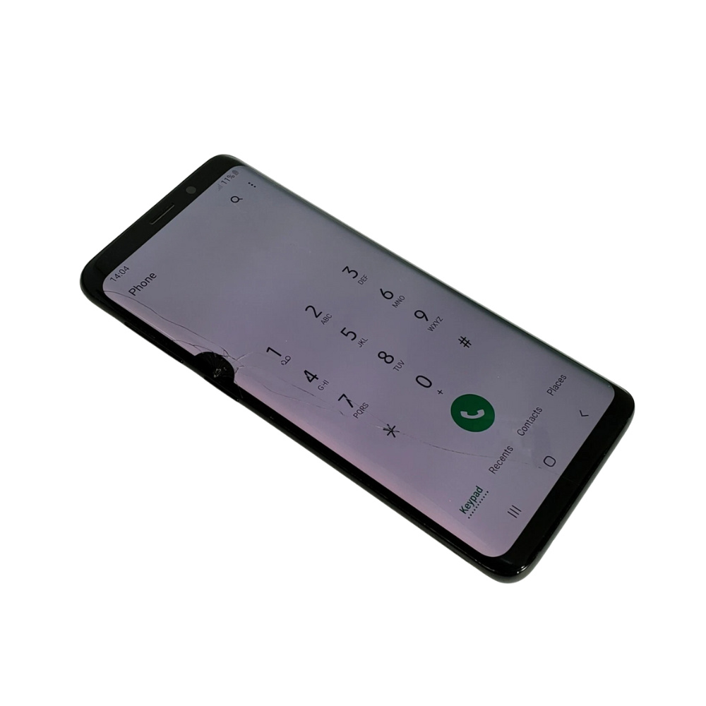 This is an original Samsung Galaxy S9 cracked screen, available for resale. While the display glass is cracked, the part may still be useful for:
