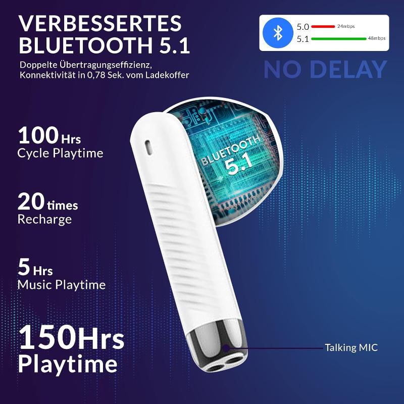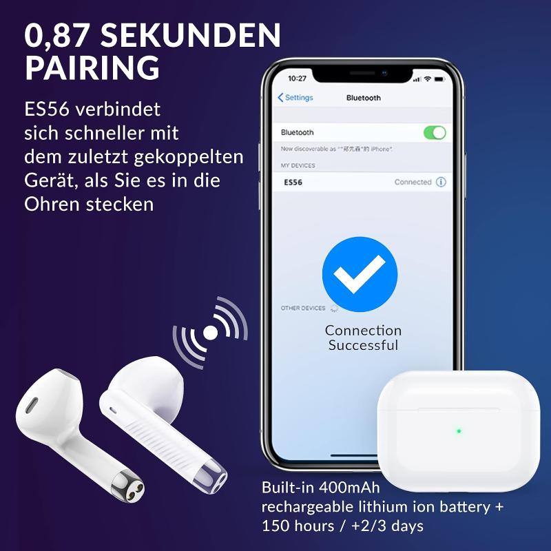ES56 Vino is a compact white TWS headset offering Bluetooth 5.1, around 4 hours of continuous use per charge, and up to 120 hours with its charging case—perfect for music and calls throughout the day.