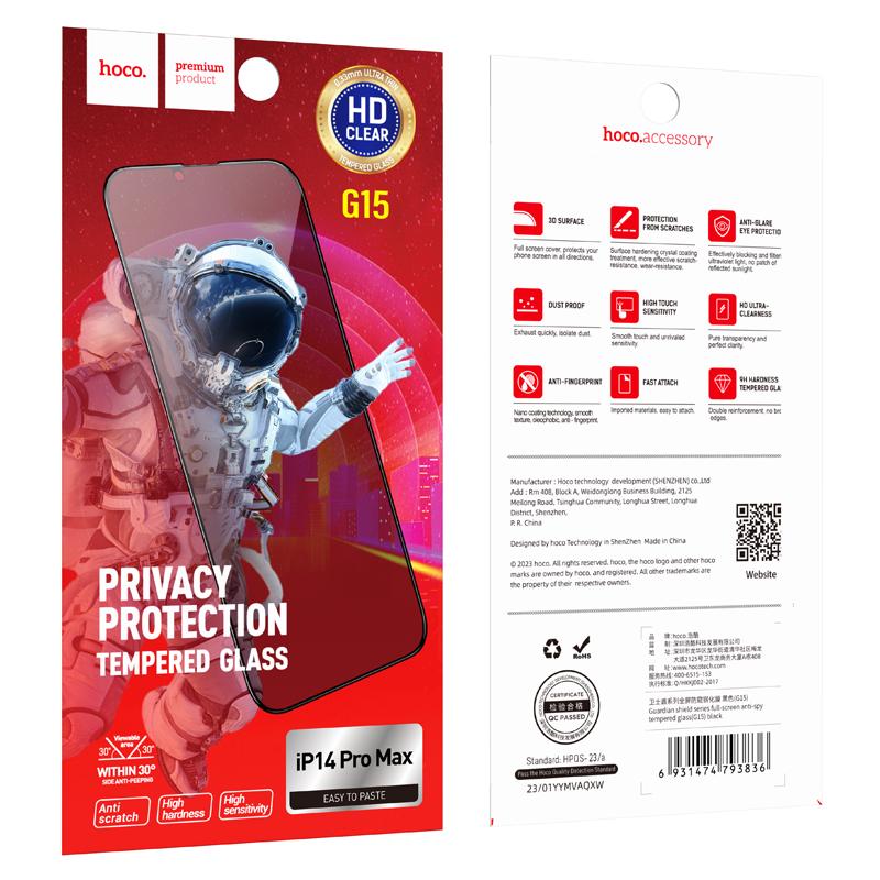 The hoco. G15 Privacy Glass Screen Protector is specifically designed for the iPhone 14 Pro, offering both screen protection and privacy. Its built-in privacy filter limits side viewing angles, ensuring that only the person directly in front of the screen can view the content clearly. Made from durable 9H tempered glass, it guards against scratches, drops, and daily wear. The oleophobic coating helps resist smudges and fingerprints. Easy to install, it adheres smoothly with bubble-free adhesive and aligns precisely with the phone’s display.