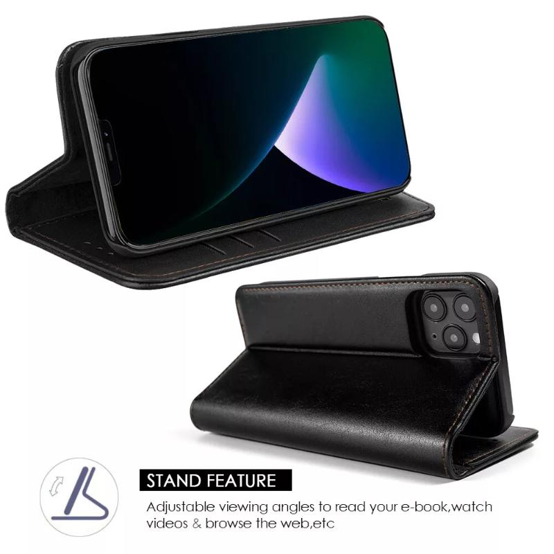 The iPhone 13/14 Flip Wallet Case W003 in black delivers a seamless blend of sophistication and practical protection. Encased in a premium PU leather exterior with a rigid internal frame, it shields your device from daily wear, drops, and scratches. The front flap features a discreet window that allows easy viewing of notifications, time, and calls without fully opening the case. Inside the flap is a secure card pocket for an ID or credit card. The case also doubles as a kickstand for hands-free media use and includes a magnetic closure to keep everything in place. Enjoy responsive protection with auto wake/sleep functionality and uninterrupted wireless charging compatibility (Qi and MagSafe).
