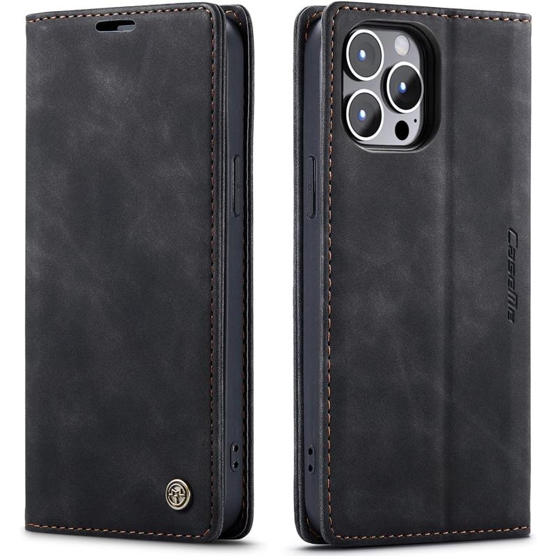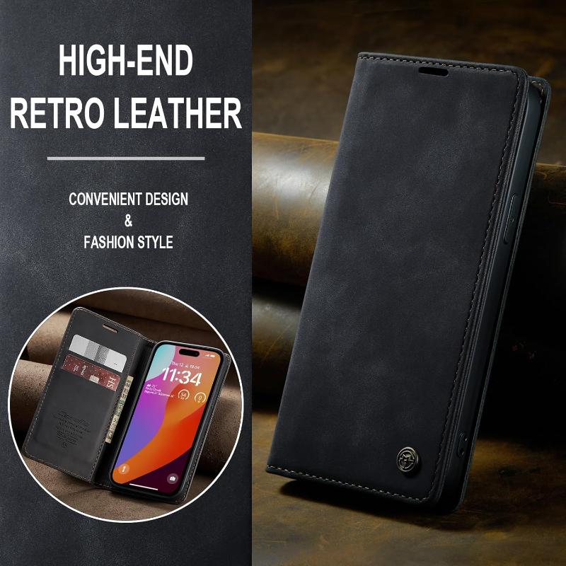 The iPhone 15 Pro Max Flip Wallet Case W003 in classic black blends protection with functionality. Crafted from premium PU leather with a durable internal frame, it safeguards your device from scratches, bumps, and everyday wear. A sleek front flap offers a discreet window to view notifications, time, and incoming calls without exposing the screen. This versatile case includes storage for a card or two, folds into a stable kickstand for comfortable media viewing, and supports auto wake/sleep functionality. It also remains fully compatible with wireless charging, so there's no need to remove the case when charging your phone.