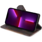 Sleek brown PU leather wallet case for iPhone 13 featuring two card slots, magnetic closure, and kickstand.