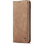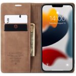Brown PU leather H12 wallet case for iPhone 13 with a built-in card slot, magnetic closure, and kickstand feature for hands-free use.