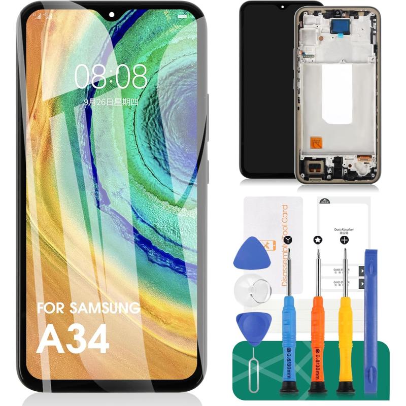 This high-quality display assembly is designed specifically for Samsung Galaxy A34 (SM‑A346, SM‑A346B for 4G; SM‑A346V, SM‑A346U for 5G) and includes the original-style Super AMOLED screen, touch digitizer, and mid-frame bezel. With the frame pre-installed, this unit is plug-and-play and avoids the complexities and risks of separating the glass and screen. It preserves under-display fingerprint functionality, ensures full display responsiveness, accurate color reproduction, and OEM-level brightness and viewing angles. Ideal for repairs, it delivers a factory-fit finish, complete with all necessary adhesive and connectors for straightforward installation.