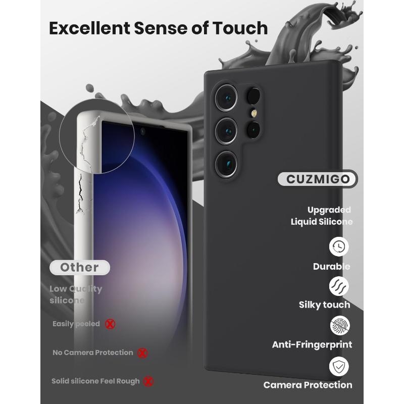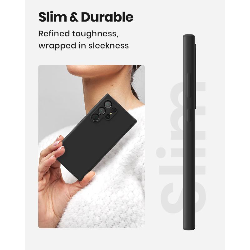 Lightweight black silicone case for Galaxy S22 Ultra, offering soft-touch grip, microfiber protection, and raised edges—all in a sleek, minimalist design.