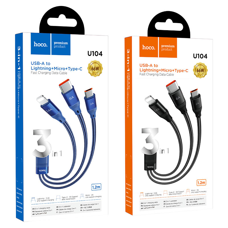 U104 Ultra, 3-in-1 charging data cable for Lightning 2.4A / Micro-USB 2.0A / Type-C 6A, aluminum alloy connectors and nylon braid, support fast charging protocols.